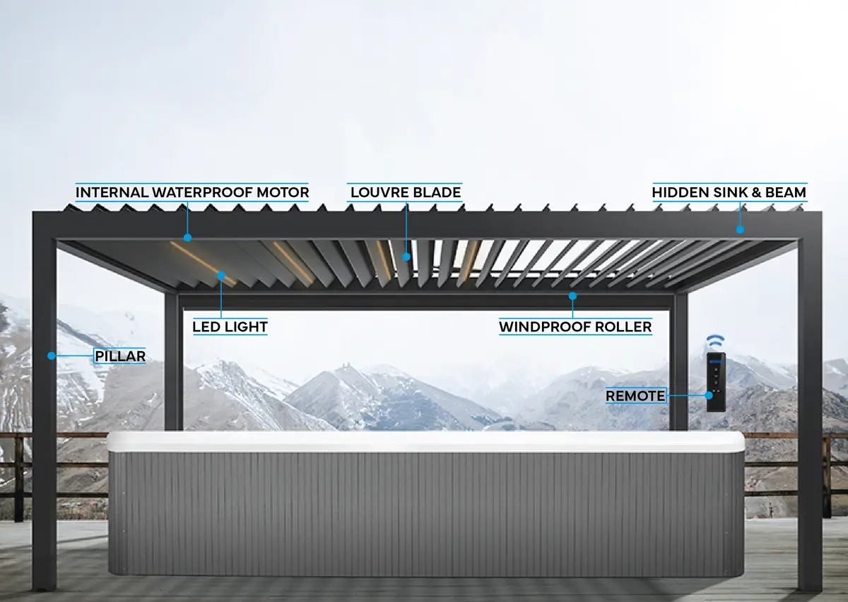 Step into your own tranquil haven with our spacious and comfortable Louvered Pergola. Craft a unique sanctuary where you can unwind, recharge, and create lasting memories. Whether you’re savoring a delightful family meal, basking in the warmth of a summer evening, or celebrating with friends, our pergola provides the perfect backdrop for relaxation and joy. Embrace the charm of outdoor living and elevate your outdoor space.